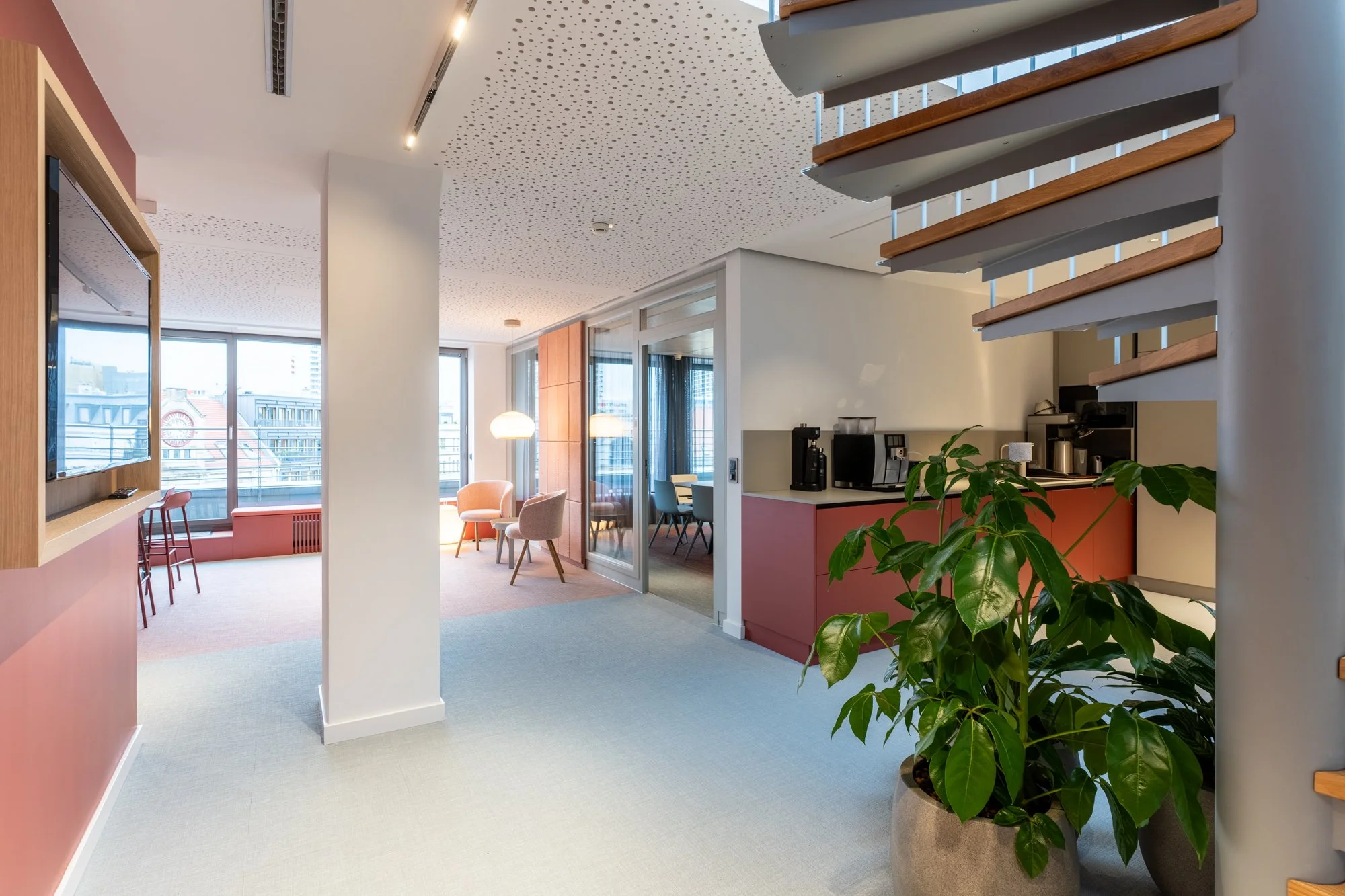 Ein zentrales Anliegen des Bauherrn war die konsequente Weiterverwendung vorhandener Bauteile und Strukturen im Sinne eines nachhaltigen Umgangs mit dem Bestand. Die bestehenden Glastrennwände sowie die Kühldecken-Elemente wurden erhalten und integrativ in das neue Raumkonzept überführt. Letztere wurden in ein neu definiertes Raster eingeordnet und auf Grundlage präziser Berechnungen in eine überarbeitete Deckenplanung eingebunden, die zugleich die Anforderungen an Beleuchtung und Lüftung erfüllt. Akustisch wirksame Deckenbekleidungen lassen die bestehenden Metallpaneele visuell zurücktreten, ohne deren Funktionalität zu beeinträchtigen. Im Zuge der Umnutzung wurde zudem der Raumakustik besondere Aufmerksamkeit gewidmet; durch den gezielten Einsatz von Akustikelementen im Trockenbau sowie von wandseitigen Absorbern konnte eine hohe akustische Qualität erzielt werden.